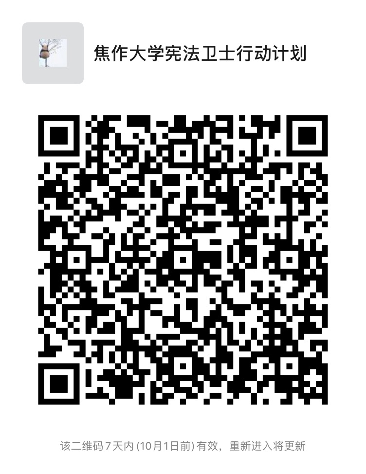 (三)做好支持保障。各院部、各部門要建立健全工作機制,認真組織廣大師生參與行動計劃。請各院部、各部門明確專人負責此項工作,加入“焦作大學憲法衛士行動計劃”工作微信群(二維碼見下方)。