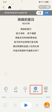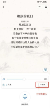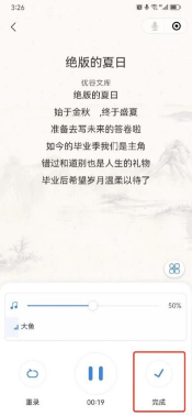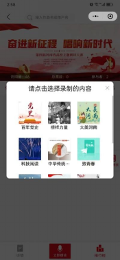 3. 報名信息填寫后,即可進入作品錄制及提交,參賽選手可圍繞“奮進新征程·唱響新時代”主題選擇文庫中合適的素材及配樂進行朗讀(錄制前在右下角“更換”選擇自己喜歡的配樂),也可以自己上傳素材朗讀,鼓勵原創;