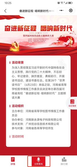 1. 掃描活動二維碼或通過微信小程序進入朗讀平臺,點擊“奮進新征程·唱響新時代”活動輪播圖海報進入活動頁面,點擊活動頁面下方【立即報名】,根據系統提示允許獲取頭像、昵稱、地區等相關信息;