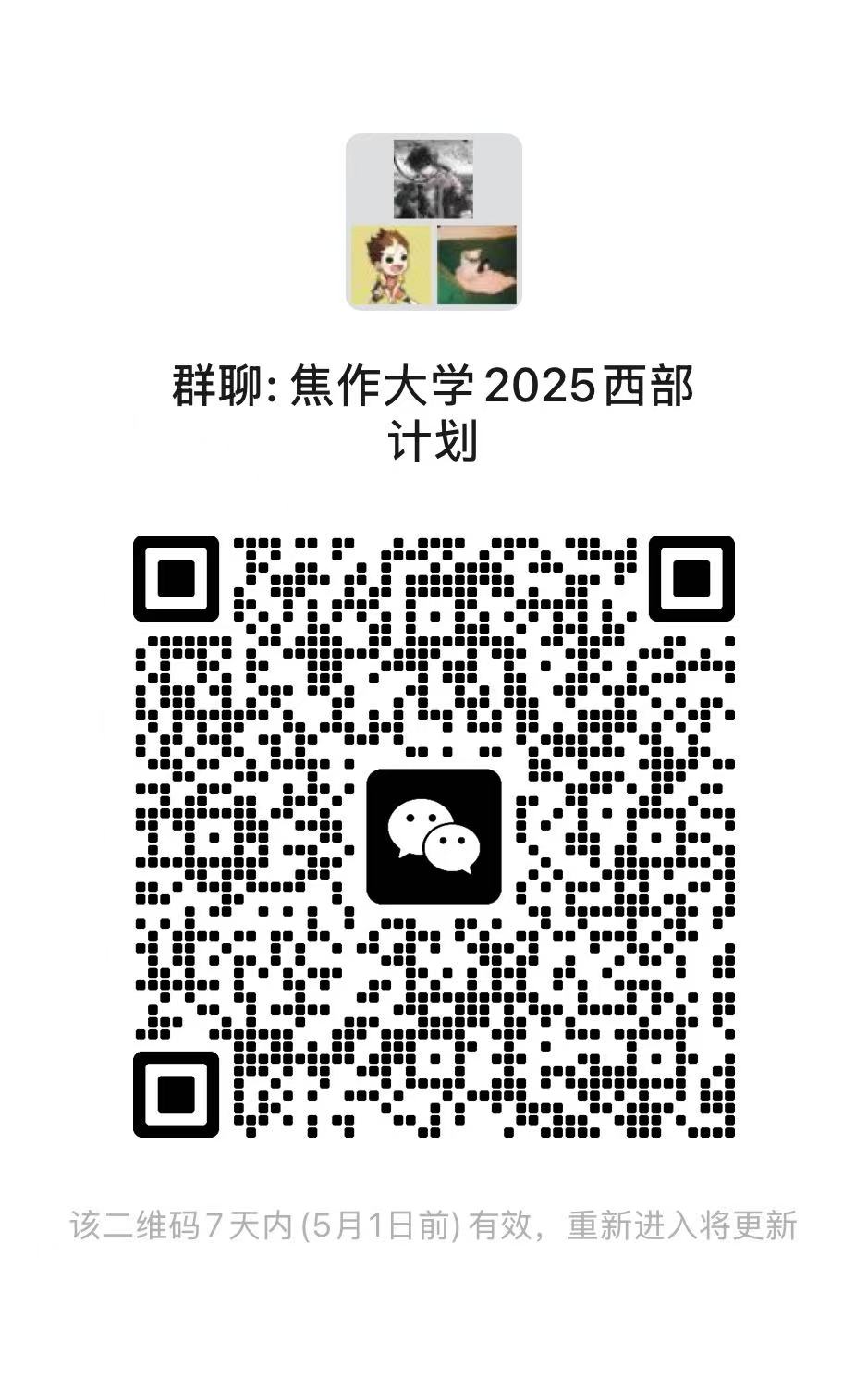 焦作大學(xué)志愿服務(wù)西部計(jì)劃和鄉(xiāng)村振興計(jì)劃項(xiàng)目辦設(shè)在校團(tuán)委。有意向報(bào)名的同學(xué)可掃描后附二維碼進(jìn)入“焦作大學(xué)2025西部計(jì)劃”微信群。如有其它疑問,請(qǐng)咨詢校團(tuán)委。