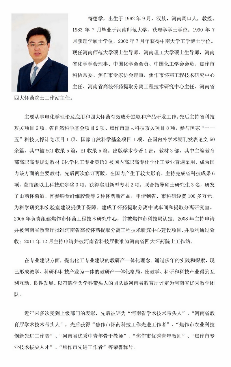 長期從事四大懷藥有效成分及產業化研究及化學化工專業教學工作。近年來,出版學術專著1部,主編并出版專業教材和教育部規劃教材3部;獲第八屆中國石油和化學工業優秀教材二等獎,主持、參與國家、省、市自然科學基金、國家科技支撐計劃項目、攻關項目、科技成果10余項。獲省教育廳科技成果二等獎1項,焦作市科技進步二等獎1項,焦作市科技進步三等獎1項。發表學術論文30余篇;研究成果獲河南省教育廳科技成果二等獎1項,焦作市科技進步二等獎2項、三等獎1項;獲得國家發明專利授權2項、實用新型專利授權6項;參與完成教育部《高等職業教育創新發展行動計劃(2015-2018)》國家級教學工程項目1項;主持省級教學工程項目2項;參與省級教學工程項目4項。