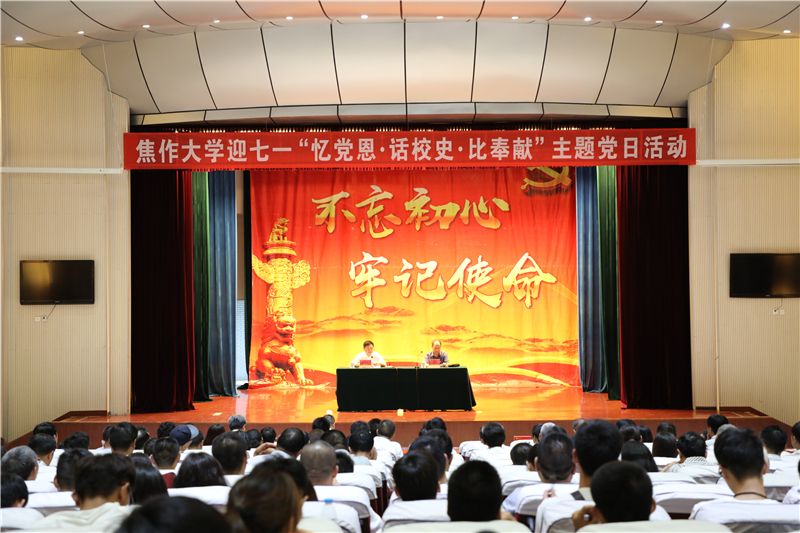 為慶祝中國共產黨97周年華誕,營造積極向上奮發有為的校園氛圍,提升各黨總支的凝聚力、戰斗力和向心力,6月28日下午,焦作大學迎七一“憶黨恩·話校史·比奉獻”主題黨日活動在南校區報告廳成功舉行。校領導魏曰高、鄭廣華、符德學、申文波出席本次活動。學校300余名黨員干部代表胸佩黨徽參加黨日活動。主題黨日活動由校黨委書記魏曰高主持。