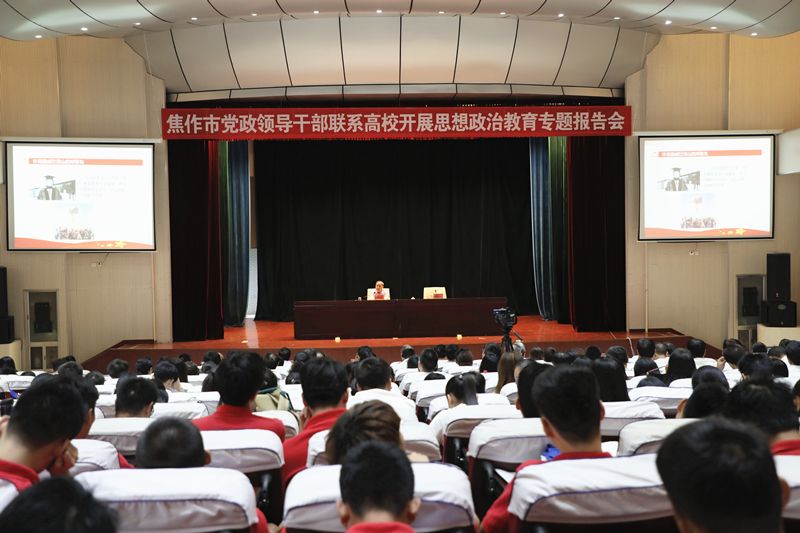 校黨委書記魏曰高指出,宮部長百忙之中為師生所作的既是一場生動的報告,更是一場觸及靈魂的思想政治教育課,體現了市委、市政府對高校思想政治教育的高度重視,對焦作大學的關心和厚愛。高校作為意識形態的前沿陣地,受到中央和省市委的高度重視。全國全省高校思想政治工作會議后,我市也多次召開思想政治工作座談會。學校黨委高度重視思想政治工作,制定了實施意見,進行了全面部署,思想政治工作質量不斷提升。3月15日,宮部長曾專程到我校,就高校思想政治工作和文明校園創建工作進行調研督導。魏書記就如何貫徹宮部長報告精神提幾點要求:1.堅定“四個自信”,不忘初心使命;2.堅持以德施教,錘煉教師素養;3.堅持立德樹人,推進“教學做”一體化改革。我們要堅持“走現代職業教育發展道路,建特色鮮明的應用型大學。”的目標,主動弘揚“自強不息、精益求精”的進取精神,自覺地踐行“我的崗位我負責,我的工作請放心”,深入推進“五項”改革(改教師、改教室、改教材、改課堂、改評價),努力實現“五點”突破(統一思想、雙師隊伍、教室革命、仿真教學、工學結合),培養社會主義建設者和接班人,助推我市在中原更加出彩中出重彩更精彩。