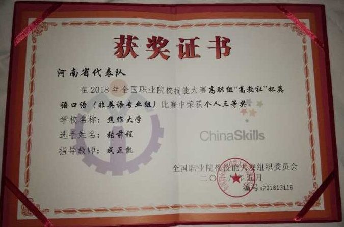 2018年6月12日到15日,全國高職院校技能大賽高職組“高教社”杯英語口語(非英語專業組)比賽在青島舉辦,我校人文學院張前程同學在指導教師成正凱老師的精心指導下,以河南省第一名的成績,代表河南省參加全國賽區的比賽。來自全國各省市的30名選手,經過職場考驗、職場描述、情景交流三個環節的激烈角逐,最終河南代表隊(焦作大學張前程)獲得全國高職院校技能大賽“高教社”杯英語口語(非英語專業組)比賽個人三等獎。這是我校在職業院校技能大賽中首次獲得河南省一等獎(第一名),也是我校首次代表河南省在國賽中獲得獎項,是我校技能大賽工作的突破。