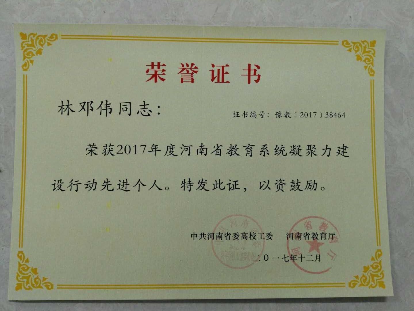 近日,中共河南省委高校工委、河南省教育廳下發(fā)文件,對(duì)全省教育系統(tǒng)凝聚力建設(shè)行動(dòng)先進(jìn)個(gè)人進(jìn)行表彰,由我校黨委宣傳統(tǒng)戰(zhàn)部推薦的信息工程學(xué)院副教授林鄧偉、經(jīng)濟(jì)管理學(xué)院副教授趙春青兩人榮獲“河南省教育系統(tǒng)凝聚力建設(shè)先進(jìn)個(gè)人”稱號(hào)。