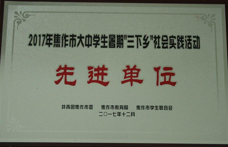 近日,團市委、市教育局、市學聯下發了《關于表彰2017年焦作市大中學生暑期“三下鄉”社會實踐活動先進集體和先進個人的決定》(焦青聯字〔2017〕12號),我校榮獲多項榮譽。校團委榮獲“2017年焦作市暑期三下鄉社會實踐活動先進單位”榮譽稱號;機電工程學院禁毒防艾宣傳團等8支團隊榮獲“優秀服務團隊”;王麗媛等8位指導教師榮獲“先進工作者”;李偉斌等26名同學榮獲“先進個人”。