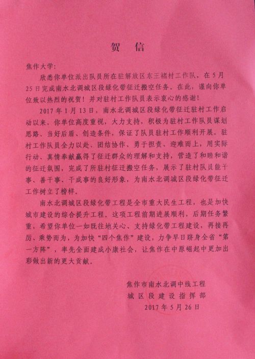 5月26日上午,學校組織部收到一封紅色的賀信,原來,這是我校前期響應市委號召,抽調優秀青年干部、經濟管理學院副院長趙春青同志參與全市重點工作“南水北調綠化帶征遷”工作取得了階段性成績,指揮部專門發來的賀信。