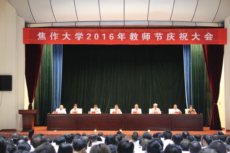 9月10日下午,在第32個教師節來臨之際,我校在學術報告廳隆重召開2016年教師節慶祝大會。校領導魏曰高、鄭廣華、楊家卿、符德學、楊中漢、申文波、張浦、霍曉麗出席會議,并為焦作大學2015-2016學年先進集體經濟管理學院、太極武術學院、招生就業處,焦作大學2015-2016學年教學標兵林鄧偉、姜楠,科研標兵宋金柱,育人標兵董小香頒獎。學校全體管理服務人員和院部副科級以上人員參加會議。會議由黨委副書記、副校長楊家卿主持。
