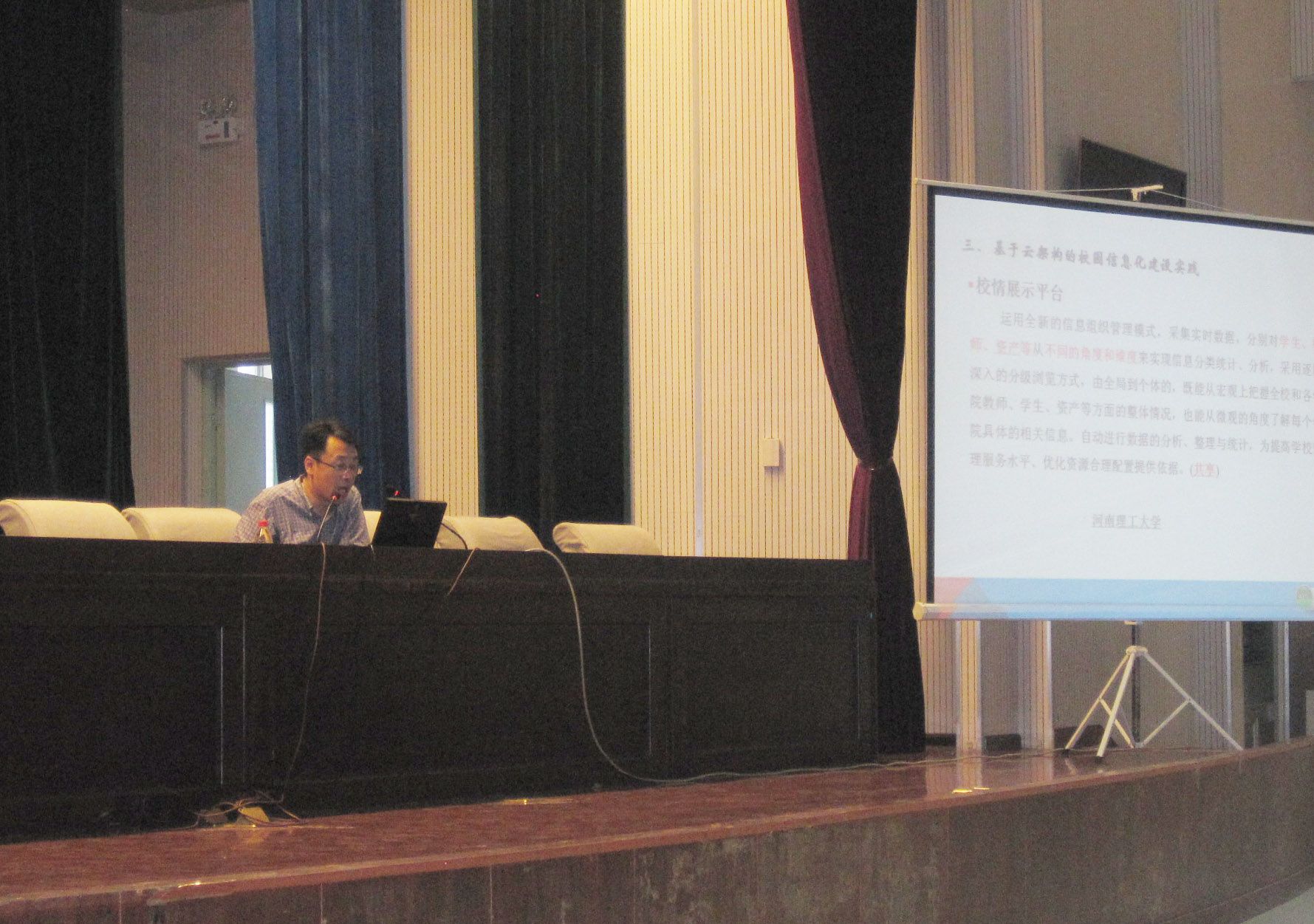 根據學校科技活動周的安排,2015年5月29日下午,學校邀請河南理工大學沈記全教授在南校區學術報告廳,為我校師生作了題為《基于云架構的高校信息化建設實踐》的學術報告。報告由信息工程學院院長豐樹謙主持。學校信息中心全體教職工、信息工程學院的部分教師、各學院管理網絡的教師以及信息工程學院和機電學院的部分學生參加了報告會。