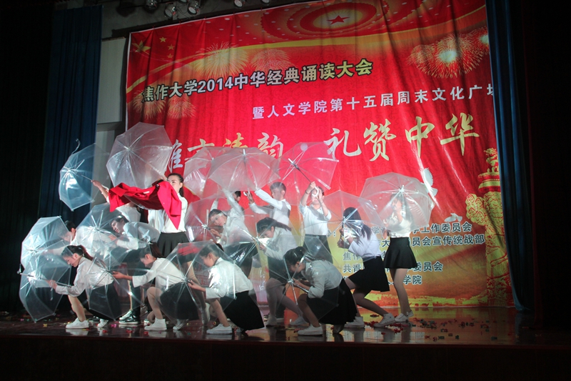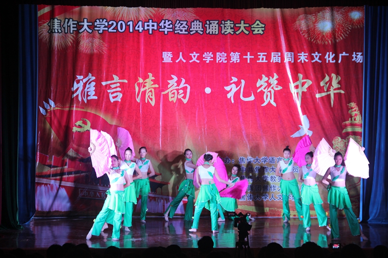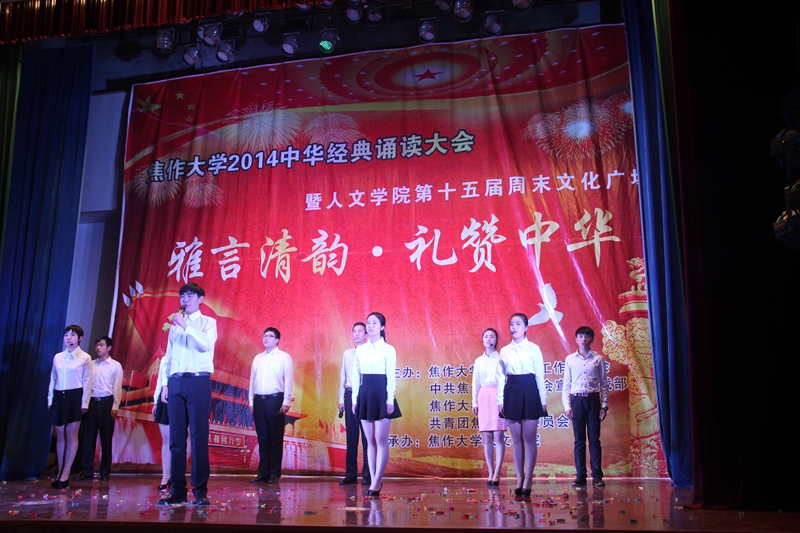 2014年11月7日下午,焦作大學2014中華經典誦讀大會在焦作大學南校區報告廳成功舉辦。此次活動由焦作大學語言文字工作委員會、焦作大學宣傳統戰部、教務處、團委主辦,焦作大學人文學院承辦。焦作大學黨委副書記、校長林效廷、副校長馬韻新及黨委宣傳統戰部、教務處、團委、人文學院等部門領導同眾多師生一起觀看了這次演出,感受經典魅力。