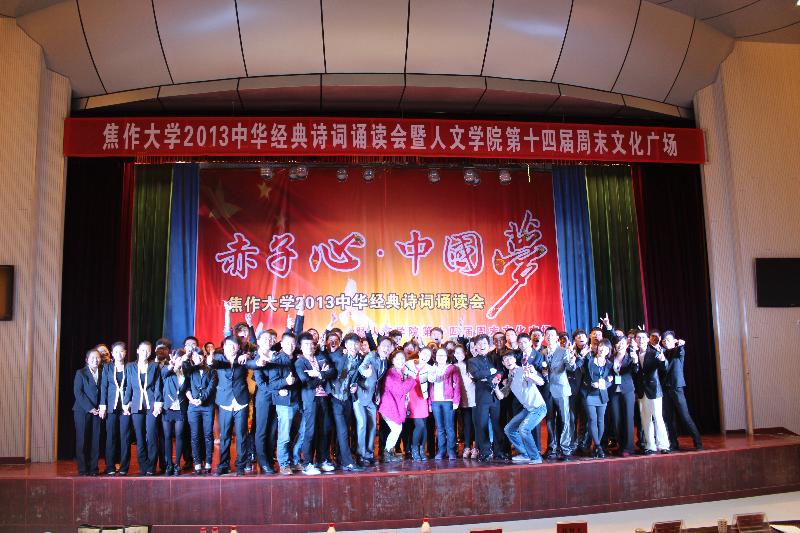 2013年10月28日下午,“焦作大學2013中華經典誦讀大會暨人文學院第十四屆周末文化廣場”在焦作大學南校區報告廳成功舉辦。