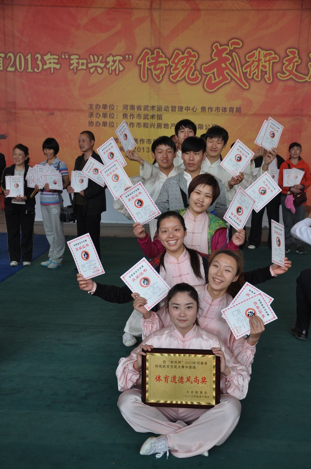 由河南省體育局主辦,河南省武術運動管理中心、河南省武術協會、焦作市體育局承辦的河南省傳統武術交流大賽于2013年4月11日—13日在焦作市武術館隆重舉行,本屆傳統武術交流大賽共有來自各省轄市、縣武術協會、武術之鄉、武術學校、武術團體等代表隊參加了本次比賽,我校共派出20名參賽人員(教練員和運動員)。在比賽中,我校代表隊技壓群雄、勇爭一流,經過兩天激烈的角逐,共有8人獲得了一等獎,11人獲得二等獎。其中獲得一等獎第一名的有6人;集體項目榮獲第一名。