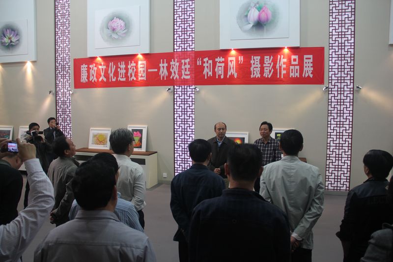 10月16日下午,焦作大學廉政文化進校園——林效廷“和荷風”攝影作品展在南校區藝術館開展。校領導郭維杰、林效廷、馬韻新、符德學、楊中漢、申文波、張浦出席開展儀式并參觀展覽。30余名部門負責人參加了開展儀式。