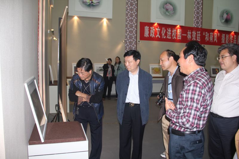 廉政攝影展共展出中國攝影家協會會員林效廷同志以“荷”為主題的攝影作品60幅。身為校長,林效廷同志工作之余喜好攝影,且特別鐘情于荷花專題的拍攝,積累了三百多品種,萬余幅荷花圖片,展出的六十幅作品,是其不同技法、不同形態的荷花作品例選。《和荷風》是林效廷同志多年來拍荷的總結和提升,其以獨特的視角品荷、贊荷,將對荷的理解和領悟與構建和諧社會的政治觀念相聯系,體現了攝影藝術與政治,自然與社會的有機結合,呈現出了一種別開生面的廉政文化氣象。