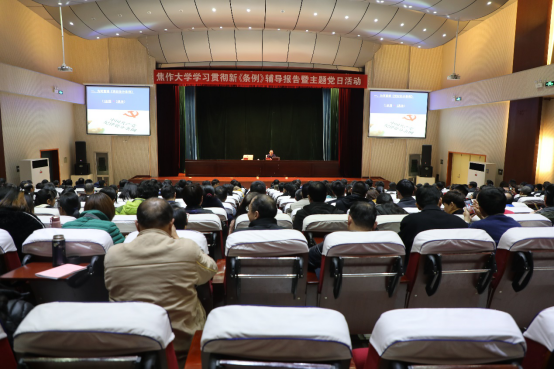 11月23日下午,學校在南校區學術報告廳舉行學習貫徹新修訂《中國共產黨紀律處分條例》(以下簡稱《條例》)輔導報告會。報告會邀請焦作市委黨校趙國松副教授主講。校領導魏曰高、鄭廣華、符德學、申文波、張浦和全校副科級以上領導干部及黨員代表一起聆聽了講座。報告會由校紀委書記張浦主持。