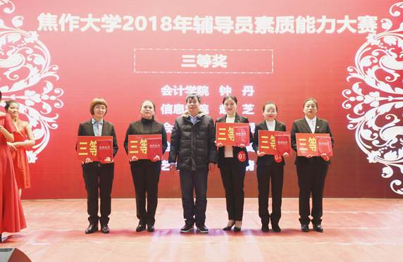 本次大賽分為初賽和決賽,初賽已于12月10日以筆試方式進(jìn)行,重點(diǎn)對(duì)輔導(dǎo)員的基礎(chǔ)理論知識(shí)和網(wǎng)文寫作能力進(jìn)行測(cè)試,經(jīng)過匿名閱卷和嚴(yán)格評(píng)審,共有10名輔導(dǎo)員以優(yōu)異的初賽成績(jī)進(jìn)入本次決賽。決賽共分理論宣講、談心談話和案例分析三個(gè)環(huán)節(jié),全面考察了輔導(dǎo)員的思想政治理論素質(zhì)、職業(yè)能力和專業(yè)素養(yǎng)。最終藝術(shù)學(xué)院閃群超、人文學(xué)院高婷婷榮獲一等獎(jiǎng);藝術(shù)學(xué)院紀(jì)詠宜、經(jīng)管學(xué)院司文杰、人文學(xué)院王毅峰榮獲二等獎(jiǎng);會(huì)計(jì)學(xué)院鐘丹、信息工程學(xué)院趙芝、會(huì)計(jì)學(xué)院王小愛、會(huì)計(jì)學(xué)院劉倩斐、藝術(shù)學(xué)院李清榮獲三等獎(jiǎng)。藝術(shù)學(xué)院、會(huì)計(jì)學(xué)院、人文學(xué)院榮獲本次大賽優(yōu)秀組織獎(jiǎng)。校黨委書記魏曰高、副校長(zhǎng)符德學(xué)、學(xué)生處處長(zhǎng)李存紅分別為優(yōu)秀組織獎(jiǎng)、一等獎(jiǎng)、二等獎(jiǎng)、三等獎(jiǎng)選手頒發(fā)了獲獎(jiǎng)證書。