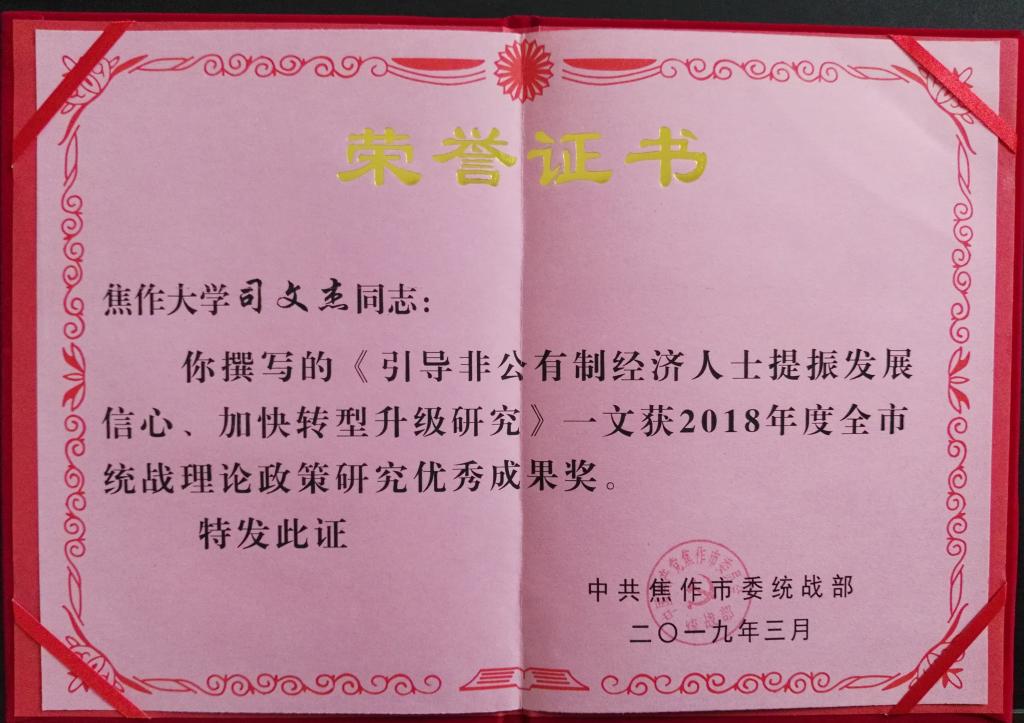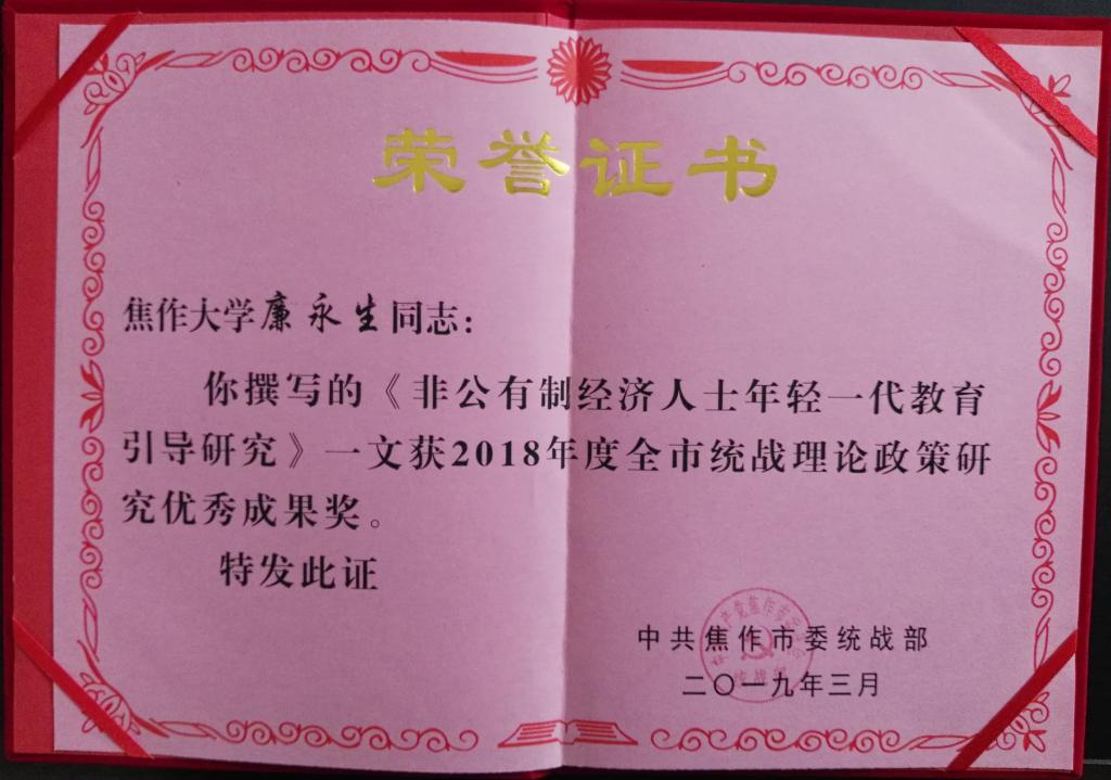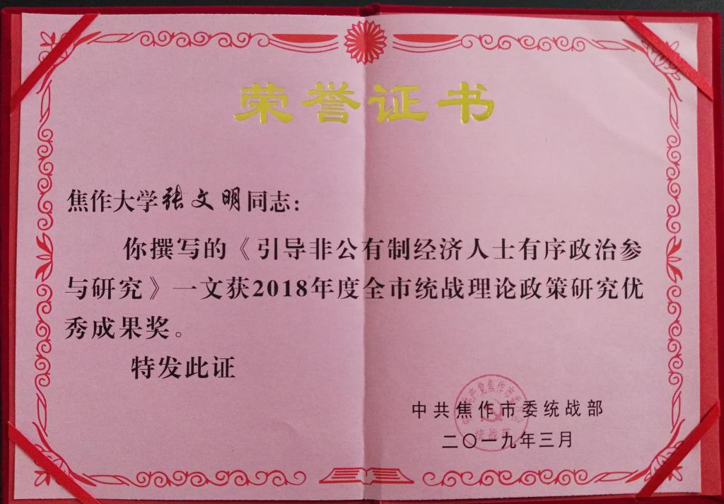 2019年3月13日,全市統戰工作會議在市會議中心召開,會議表彰了2018年度統戰工作的先進單位和個人,我校廉永生、司文杰、張文明三人撰寫的統戰理論文章榮獲2018年度全市統戰理論政策研究優秀成果獎。