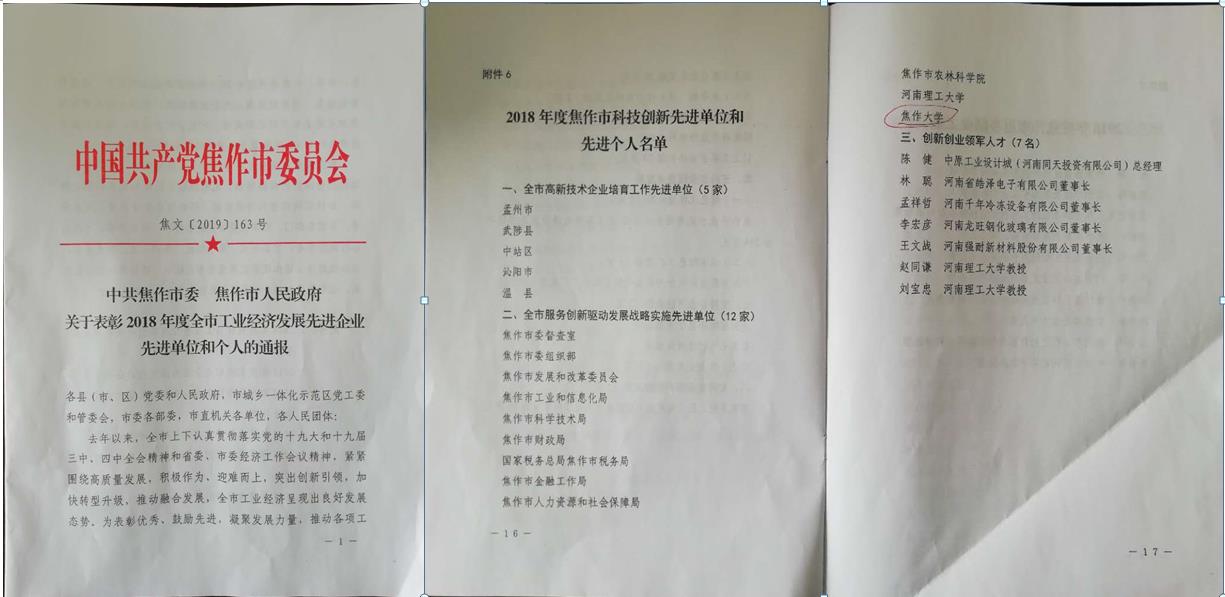 近日,中國共產(chǎn)黨焦作市委員會(huì)下發(fā)《中共焦作市委 焦作市人民政府關(guān)于表彰2018年度全市工業(yè)經(jīng)濟(jì)發(fā)展先進(jìn)企業(yè)先進(jìn)單位和個(gè)人的通報(bào)》(焦文[2019]163號(hào)),我校榮獲焦作市2018年度全市服務(wù)創(chuàng)新驅(qū)動(dòng)發(fā)展戰(zhàn)略實(shí)施先進(jìn)單位。