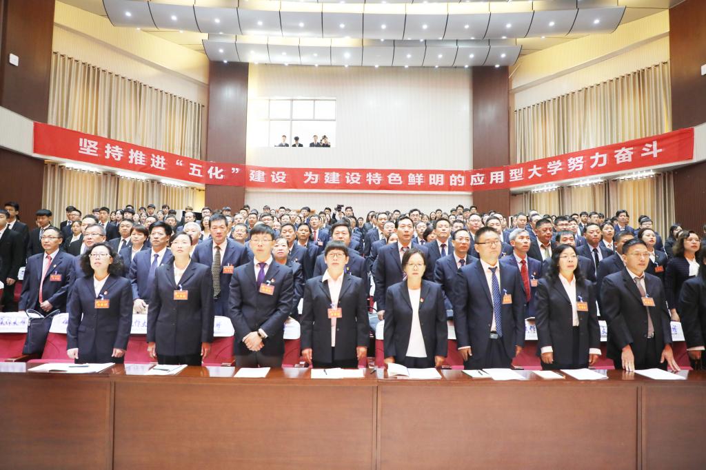 會場氣氛熱烈,代表精神飽滿。主席臺上方懸掛著“中國共產黨焦作大學第二次代表大會”的會標,后幕正中是鐮刀和錘頭組成的黨徽,10面鮮艷的紅旗分列兩側。會場后面懸掛著“堅持推進‘五化’建設 為建設特色鮮明的應用型大學努力奮斗”的橫幅。