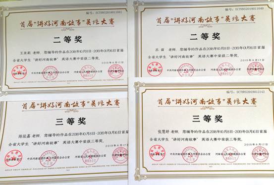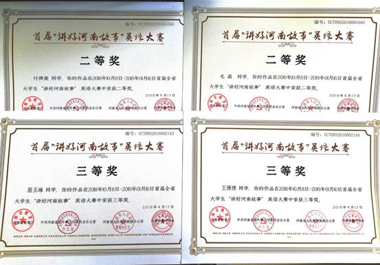 近日,由河南省教育廳、河南省政府外事僑務辦公室、河南省政府新聞辦公室、河南省翻譯協會聯合主辦的首屆“講好河南故事”英語大賽獲獎名單公布,我校4名同學在此次比賽中取得好成績,其中信息工程學院付舜虔、外國語學院毛磊榮獲二等獎,外國語學院屈玉琳、外國語學院王博博獲得三等獎,外國語學院呂苗、王亞莉、張慧婷、陳依嘉四位老師分別獲得優秀指導教師。