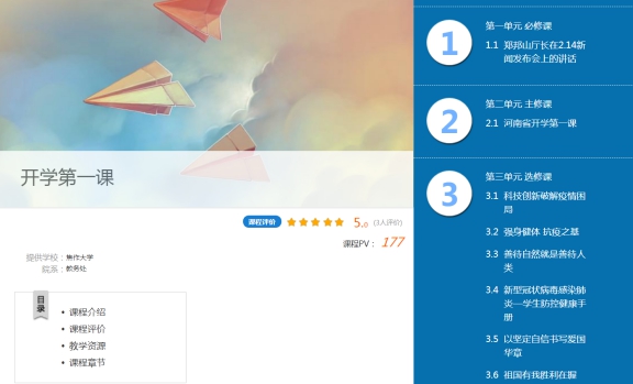 2月18日,我校共有一萬三千多名分布在不同地市的學生和五百多名教職工,通過超星“學習通”收看了《鄭邦山廳長在2.14新聞發布會上的講話》、《河南省開學第一課》、《科技創新破解疫情困局》、《以堅定自信書寫愛國華章》等課程。教育廳領導和來自抗疫一線、教育一線的八位專家真摯殷切的講授,深深地感染了全校師生,使“開學第一課”成為家國情懷的教育、生命健康的教育、信念理想的教育、科學普及的教育、道德法治的教育。