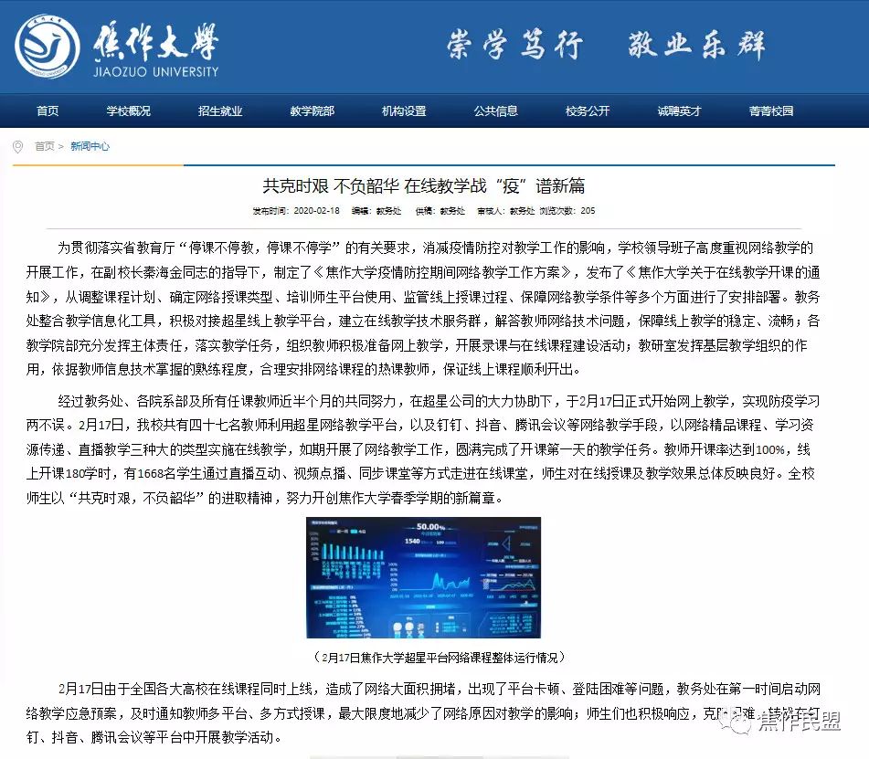 民盟焦作市委副主委林鄧偉作為焦作大學(xué)教務(wù)處處長,在接到上級有關(guān)“停課不停學(xué)”的要求后,黑著眼眶熬著夜,爭分奪秒地學(xué)習(xí)文件,領(lǐng)會精神,以最快地速度帶領(lǐng)全處上下對學(xué)校的網(wǎng)絡(luò)教學(xué)各項(xiàng)工作做出了具體安排,為順利開展疫情防控期間的網(wǎng)絡(luò)教學(xué)提供了堅(jiān)實(shí)地保證。
