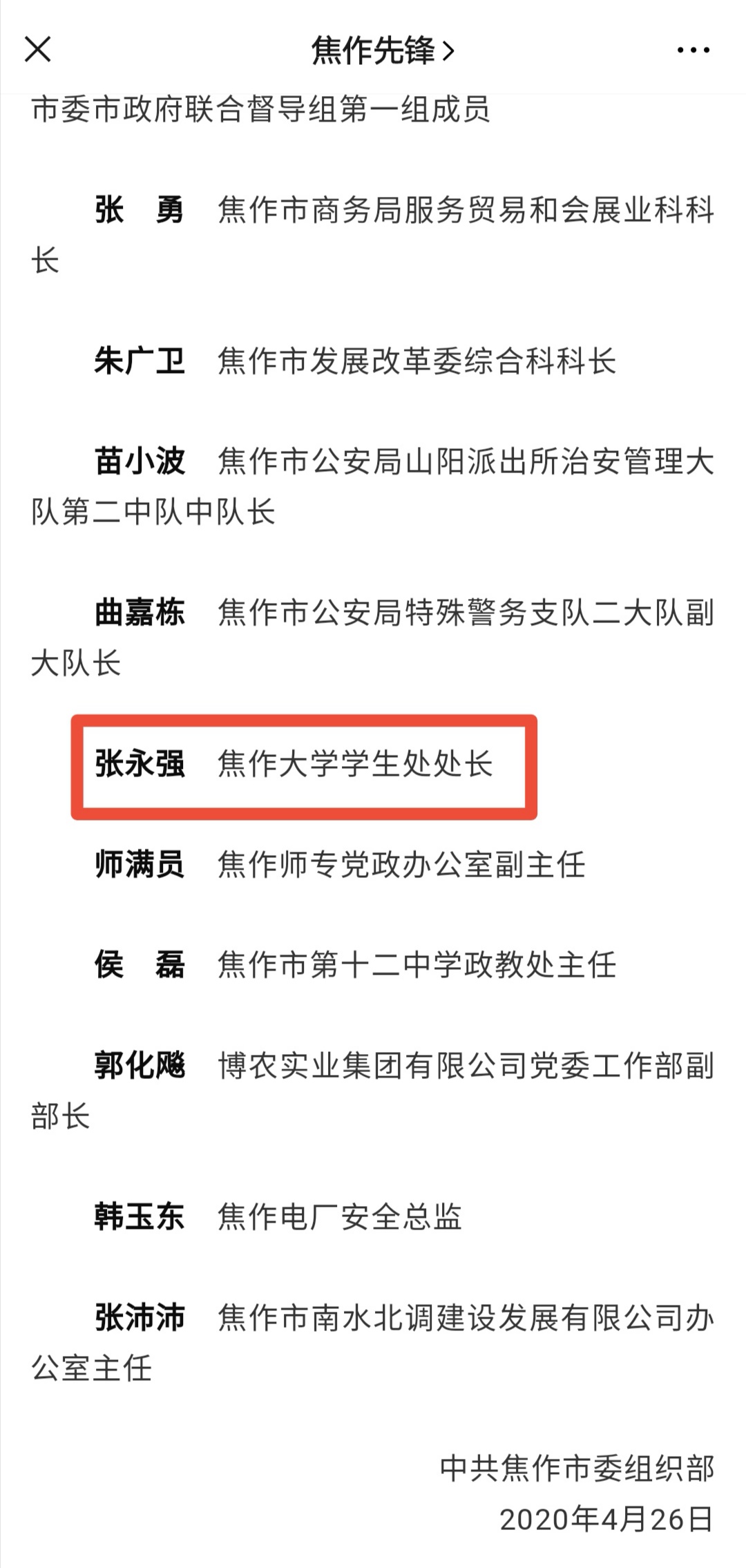 4月27日,焦作市委組織部通過“焦作先鋒”微信平臺,對在新冠肺炎疫情防控工作中表現突出的基層黨組織和共產黨員進行了通報表揚。其中,我校學生處處長張永強被評為在新冠肺炎疫情防控工作中表現突出共產黨員。