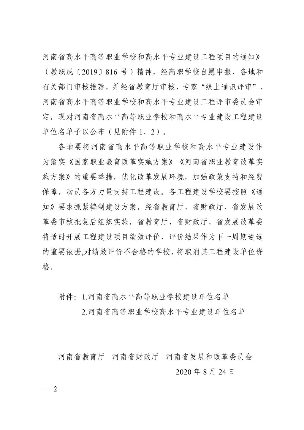 近日,河南省教育廳、河南省財政廳、河南省發展和改革委員會正式公布河南省高水平高等職業學校和高水平專業建設工程(以下簡稱“高職雙高工程”)建設單位名單(教職成〔2020〕337 號),我校成功入選河南省高水平高等職業學校和高水平專業建設工程建設單位。