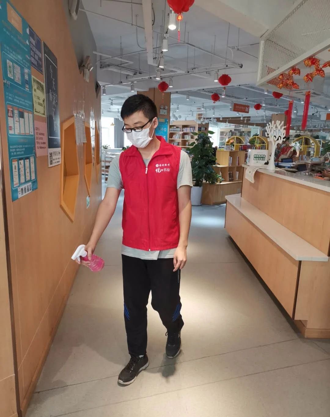 實踐隊員徐曉龍每天到張洼新村悅書房開展整理書籍、打掃衛(wèi)生、場地消毒等工作。暑假來這里借書的小朋友很多,每次借閱或者還書,他都要根據(jù)書的編號逐一歸位,當發(fā)現(xiàn)有破損書籍時,需要拿給工作人員進行修補。有讀者不會使用借書機器時給予幫助。疫情防控已進入常態(tài)化,由于書房讀者較多,他每天對書房進行三次消毒,讓讀者們放心閱讀。