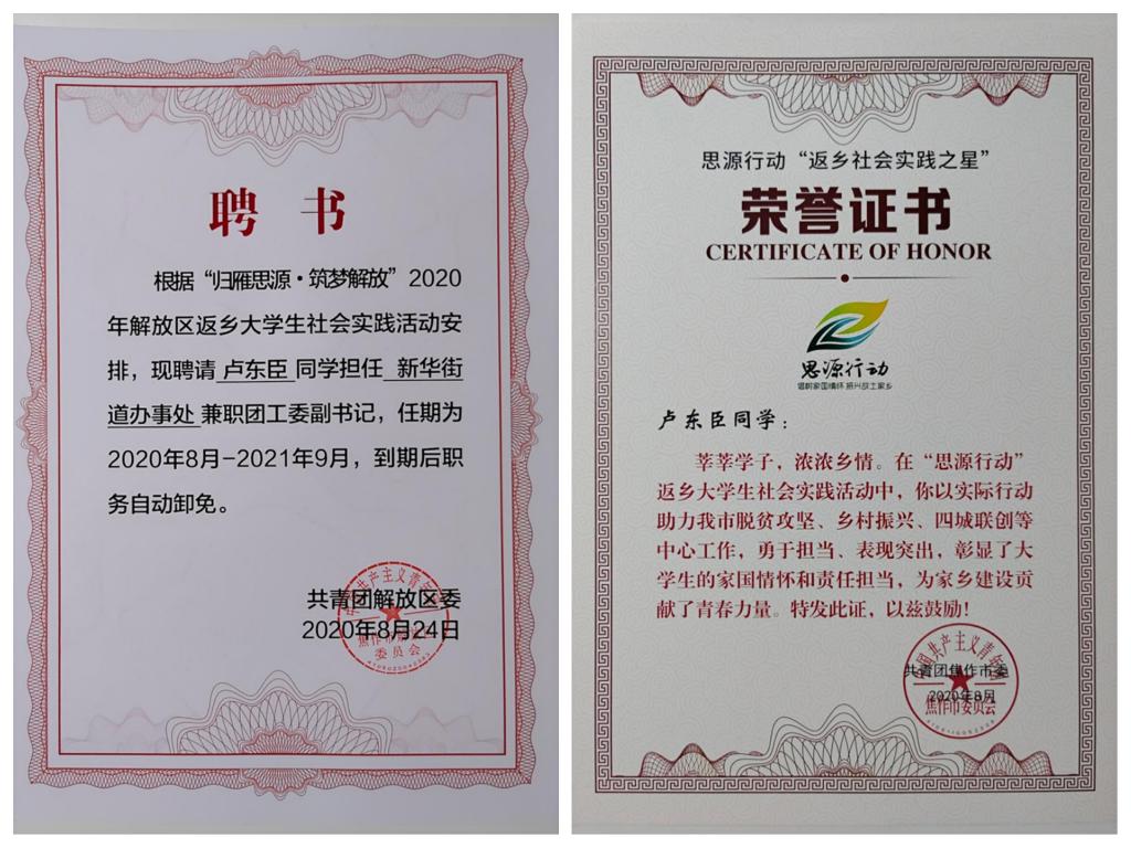 由于在實踐活動中表現(xiàn)突出,盧東臣被共青團解放區(qū)委聘請為新華街道辦事處兼職團工委副書記,獲得共青團焦作市委頒發(fā)的思源行動“返鄉(xiāng)社會實踐之星”,焦作日報校園之聲、解放區(qū)團委微信公眾號對實踐隊員的先進事跡進行了報道,為我校暑期社會實踐活動添上絢麗的色彩。