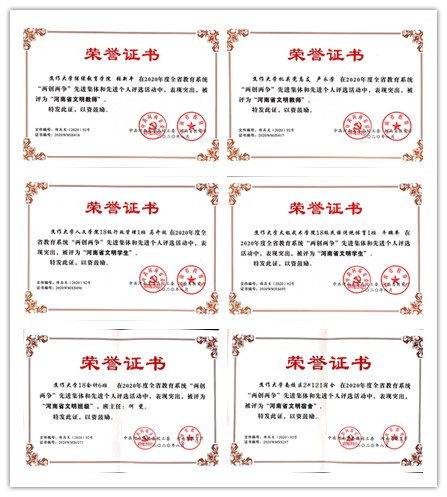 近日,中共河南省委高校工委、河南省教育廳印發《關于公布2020年度全省教育系統“兩創兩爭”活動先進集體和先進個人評選活動的通知》(豫高發﹝2020﹞92號),對2020年度全省教育系統“兩創兩爭”活動先進集體和先進個人進行表彰。我校繼續教育學院張新平、機關黨總支盧永芳榮獲“河南省文明教師”榮譽稱號,人文學院18級行政管理1班馬開放、太極武術學院18級民族傳統體育1班牛鵬舉榮獲“河南省文明學生”榮譽稱號,南校區2#121宿舍榮獲“河南省文明宿舍”榮譽稱號,18會計6班(班主任:何斐)榮獲“河南省文明班級”榮譽稱號。