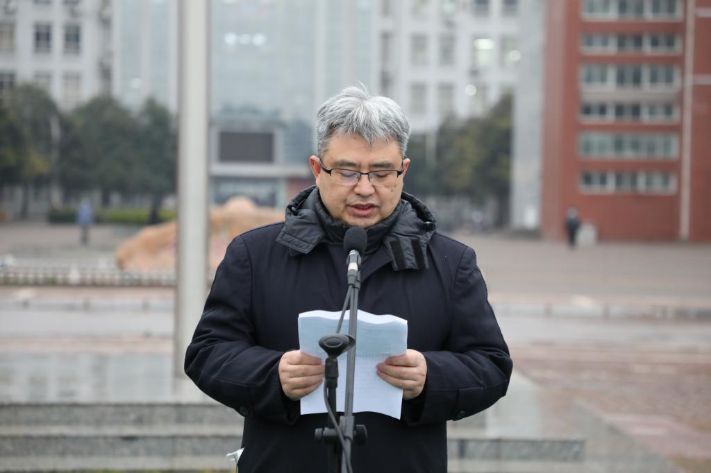 升旗儀式結束后,校領導代表學校致辭。剛剛過去的2020年,是極不平凡的一年。面對突發疫情,全校師生員工迎難而上、砥礪前行,取得了疫情防控和事業發展的雙豐收。學校以最大的管控力度,堅決做好疫情防控工作,深入開展“把災難當教材,與祖國共成長”主題教育,使抗擊疫情成為最厚重的思政大課和最鮮活的愛國主義教材。學校在內涵建設取得顯著成績的同時,還成功入選河南省高水平高等職業學校和高水平專業建設工程建設單位,榮獲“河南省省級優質專科高等職業院校”、全省教育系統網絡安全和信息化工作先進集體、焦作市創建全國文明城市先進單位等榮譽稱號。同時,向大家提出三點希望:一是胸懷夢想砥礪前行,二是積極主動開拓創新,三是務實重干鑄就輝煌。希望廣大師生要堅定信心,知行合一,對標先進,敢于擔當。