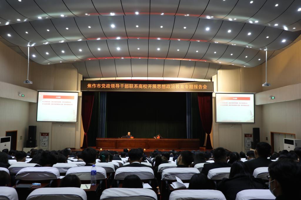 3月26日下午,焦作市黨政領導干部聯系高校開展思想政治教育專題報告會在我校南校區學術報告廳舉行。焦作市委常委、宣傳部部長宮松奇為我校師生作黨史教育專題報告。報告會由校黨委書記魏曰高主持,全校正科級以上干部、馬克思主義學院全體教師、全體輔導員以及部分學生代表聆聽了報告。