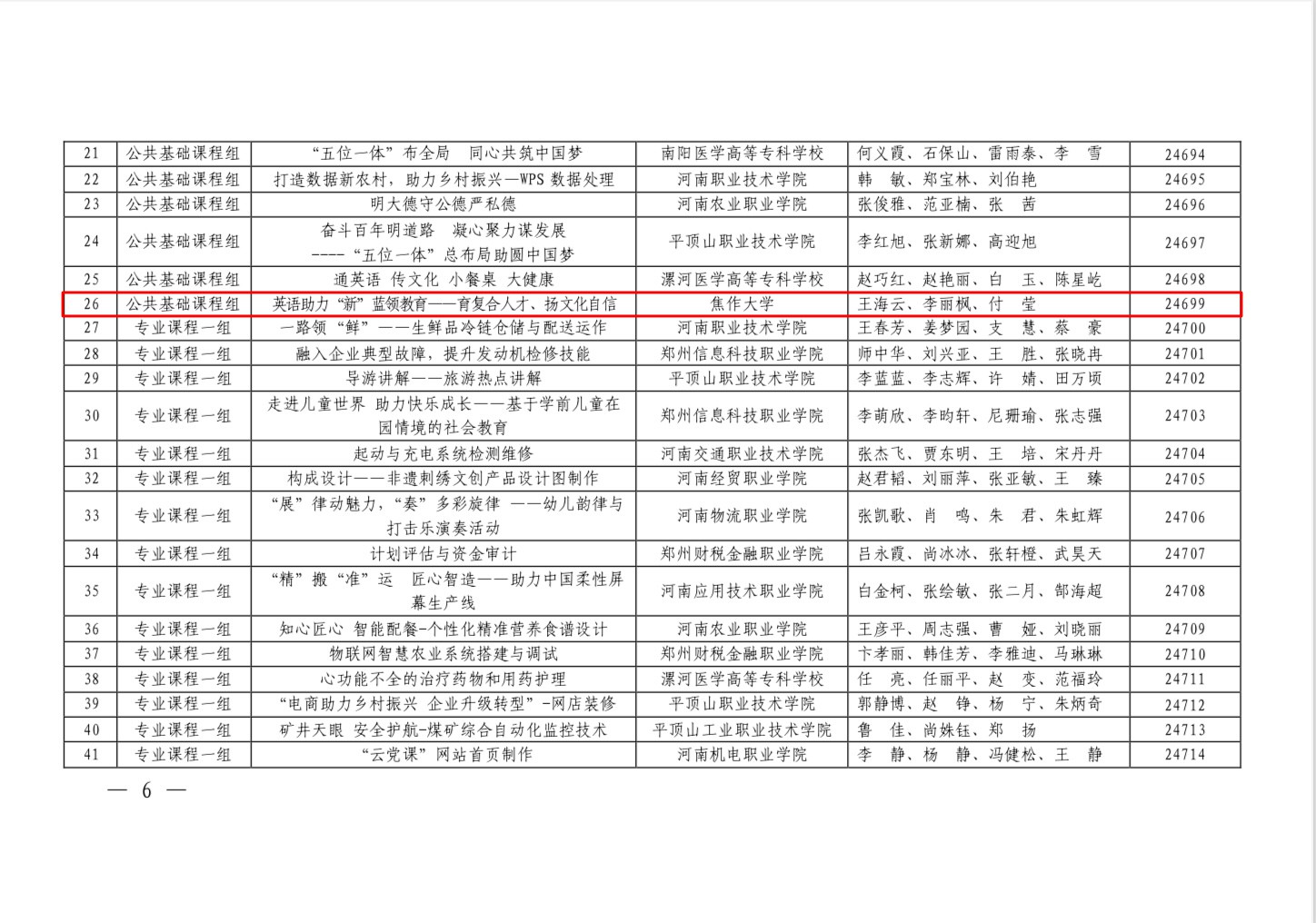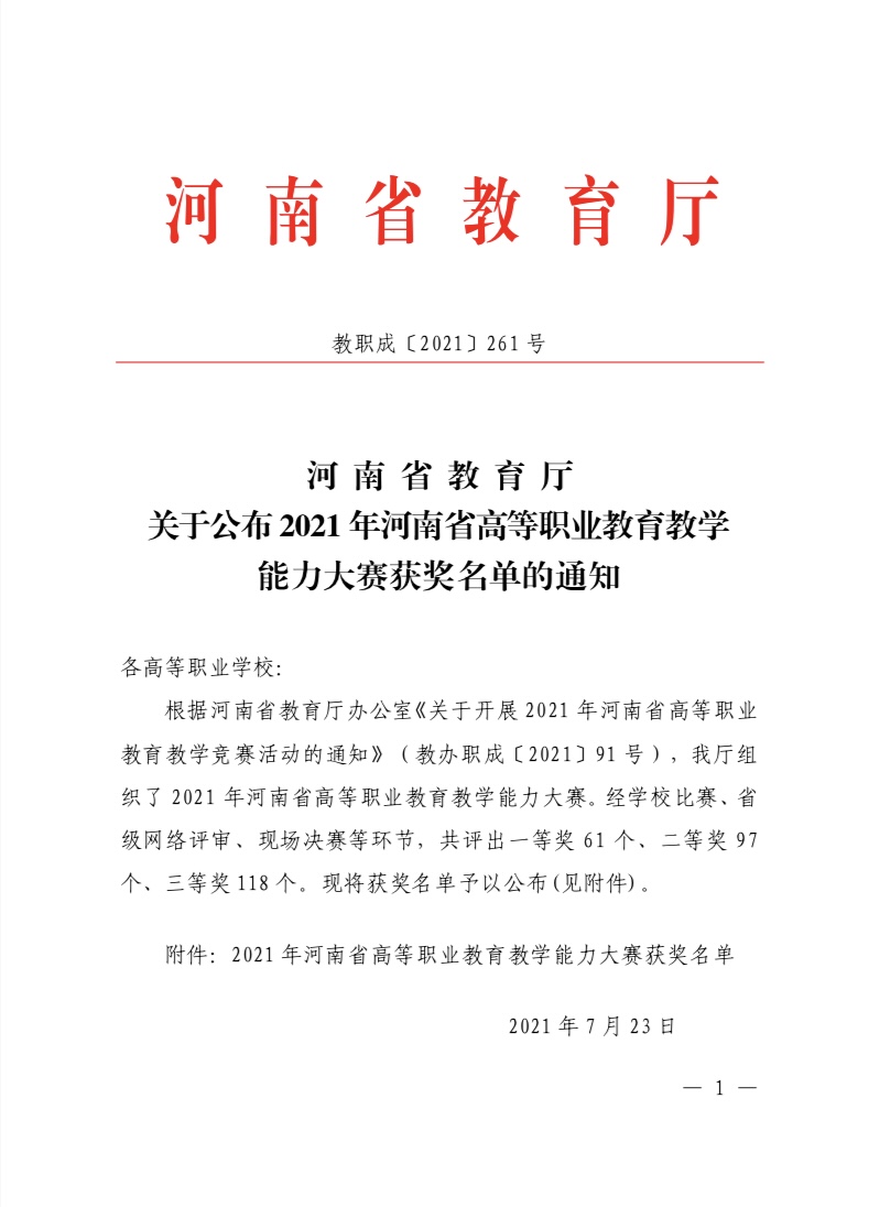根據河南省教育廳辦公室《關于開展2021年河南省高等職業教育教學競賽活動的通知》(教辦職成〔2021〕91號)和我校《焦作大學2021年度教師教學能力比賽活動方案》(教務處〔2021〕45號)《關于焦作大學2021年度教師教學能力比賽校級決賽的通知》(教務處〔2021〕51號),經教師自主申報、院級初賽、校級專家評審和現場比賽、上報省級網絡評審、省級現場決賽等多個環節的積極準備,我校參與2021年河南省高等職業教育教學能力大賽的6支團隊再創佳績,三個組別共6項作品均獲獎,其中二等獎3項,三等獎3項。