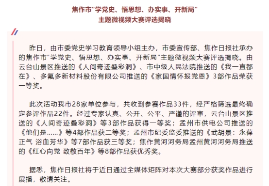 近日,由市委黨史學習教育領導小組主辦,市委宣傳部、焦作日報社承辦的焦作市“學黨史、悟思想、辦實事、開新局”主題微視頻大賽評選揭曉。我校藝術學院作品《唱支新歌給黨聽》榮獲三等獎。