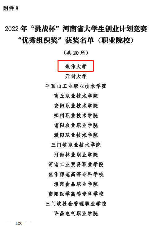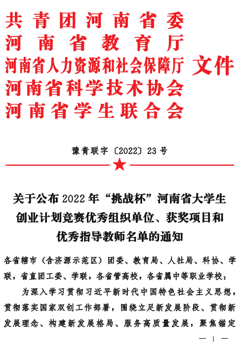 近日,由共青團河南省委、河南省教育廳、河南省人力資源和社會保障廳、河南省科學技術協會、河南省學生聯合會聯合下發了《關于公布2022年“挑戰杯”河南省大學生創業計劃競賽優秀組織單位、獲獎項目和優秀指導教師名單的通知》(豫青聯字〔2022〕23號)。我校在比賽中表現優異,獲得代表大賽集體成績的“優秀組織獎”榮譽稱號。我校學子作品在省賽中斬獲金獎3項、銅獎4項的歷史最好成績,栗巖、侯強等12位教師被授予“優秀指導教師”稱號。
