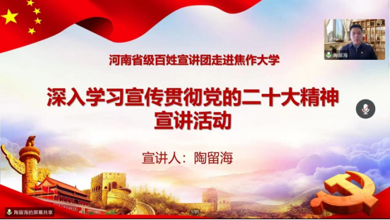 12月21日,黨的二十大代表、省級“百姓宣講團”成員、國網(wǎng)河南省電力公司高級技師陶留海老師以視頻會議的形式為我校師生作學(xué)習(xí)宣傳貫徹黨的二十大精神宣講報告。學(xué)校全體正科級及以上領(lǐng)導(dǎo)干部,馬克思主義學(xué)院全體教師,各學(xué)院教師代表、輔導(dǎo)員代表、學(xué)生代表參加報告會。會議由校黨委書記汪詩懷主持。