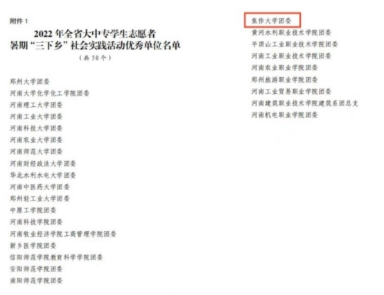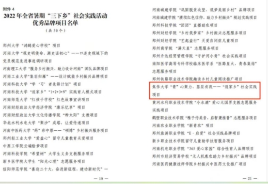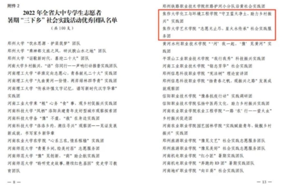 近日,由省委宣傳部、省教育廳、團省委、省學聯聯合下發了《關于2022年全省大中專學生志愿者暑期文化科技衛生“三下鄉”社會實踐活動的通報》(豫青聯字〔2023〕2號),我校榮獲“優秀單位”,化工與環境工程學院“守衛藍天凈土,助力鄉村振興”實踐團、藝術學院“志愿無止盡,星火永傳承”社會實踐服務團榮獲“優秀團隊”,機電工程學院黨政辦公室主任王珊、土木建筑工程學院團總支書記張波榮獲“優秀個人”,校團委“青”心聚力,基層有我——“返家鄉”社會實踐項目榮獲“優秀品牌項目”榮譽稱號。