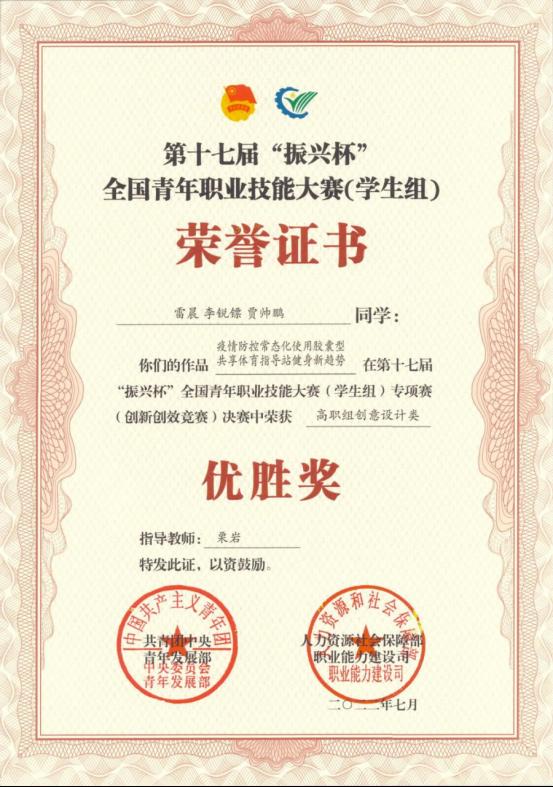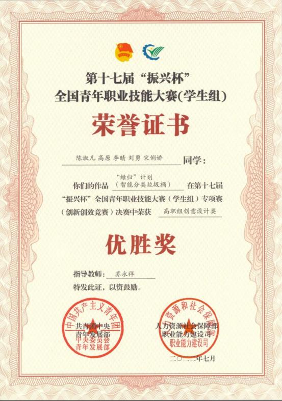 近日,由共青團中央、人力資源和社會保障部聯合舉辦的第十七屆“振興杯”全國青年職業技能大賽(學生組)評獎結果揭曉。我校化工與環境工程學院院長蘇永祥教授指導的作品《“綠歸”計劃(智能分類垃圾桶)》、校團委栗巖指導的作品《疫情防控常態化使用膠囊型共享體育指導站健身新趨勢》榮獲全國優勝獎,這是我校首次在該項賽事上獲獎。