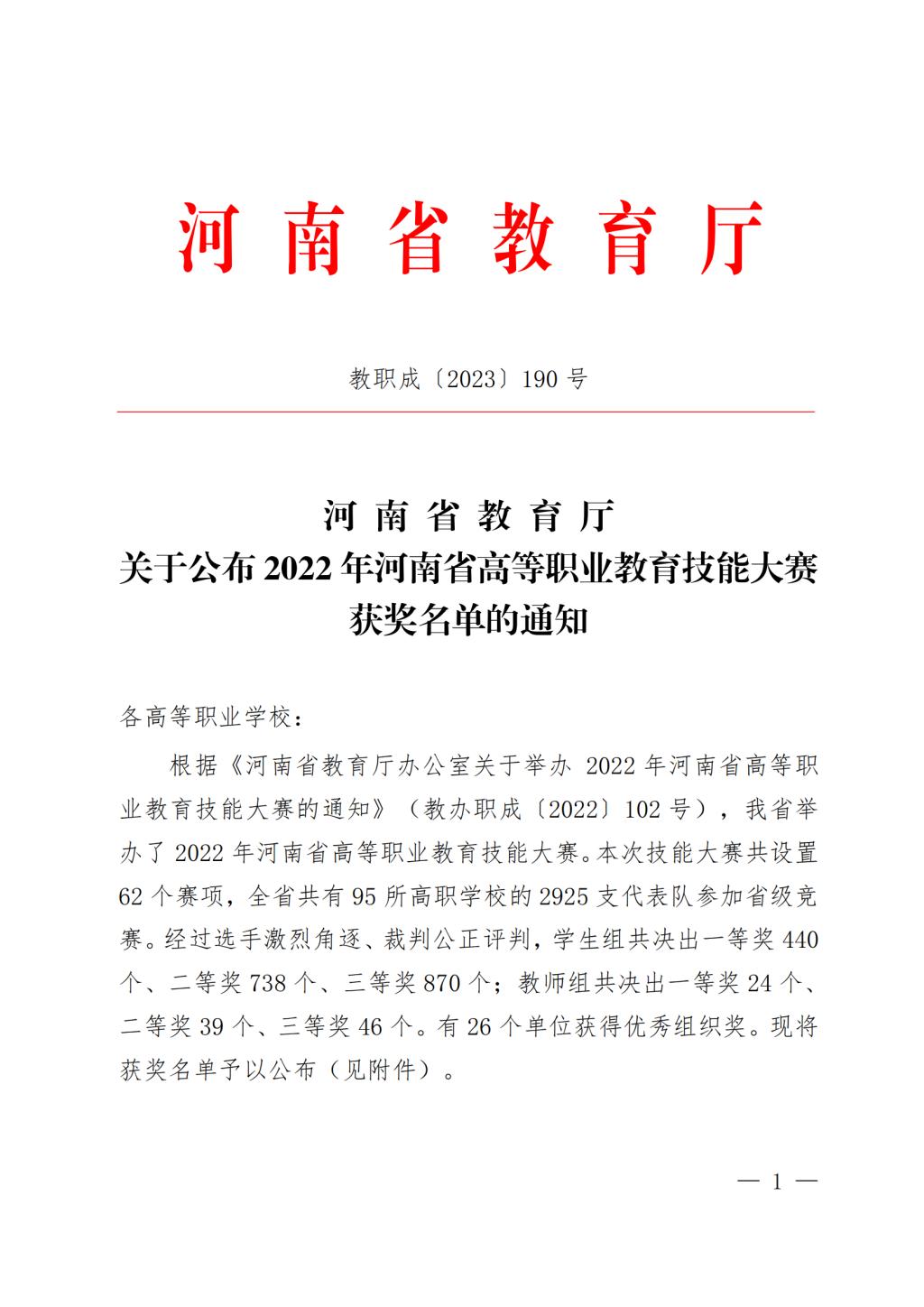 近日,河南省教育廳公布2022年河南省高等職業教育技能大賽獲獎結果,本次技能大賽共設置62個賽項,全省共有95所高職學校的2925支代表隊參加省級競賽,我校共派出62個代表隊,參加了35個高職組賽項。我校參賽師生共獲得學生組項目一等獎3項、二等獎16項、三等獎27項;教師組項目二等獎1項、三等獎1項,共計獲獎48項,獲獎數量突破新高。