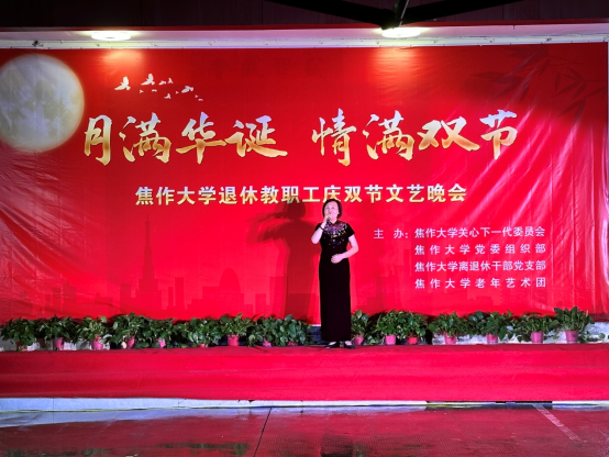 9月28日晚,伴著瀝瀝細雨,迎著涼爽秋風,焦作大學退休教職工慶雙節文藝晚會在女生獨唱《親吻祖國》中拉開了帷幕。男、女聲獨唱、男女聲小合唱、薩克斯、口琴獨奏、旗袍秀、舞蹈等多樣的節目展現在人們眼前,給節日的焦作大學增添一抹精彩。焦作市政協副主席、焦作大學校長霍曉麗,焦作大學原校長、離退休干部黨支部書記靳有海,黨委委員、組織部部長王友軍以及組織部的全體工作人員全程觀看演出。