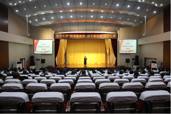 12月4日下午,焦作大學(xué)“做清廉表率、當(dāng)干事先鋒”演講比賽在南校區(qū)報告廳舉行。學(xué)校領(lǐng)導(dǎo)汪詩懷、靳賢勝、秦海金、宋萍、李秋生、林鄧偉及市紀(jì)委監(jiān)委第二監(jiān)督檢查室主任馬娜娜出席演講比賽并給獲獎選手頒獎,學(xué)校副科級以上領(lǐng)導(dǎo)干部現(xiàn)場觀看了比賽。