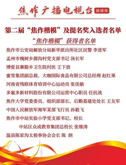 第二屆“焦作楷模”共10人,他們中有助力尋親為民化解矛盾的公安民警、有革故鼎新振興鄉(xiāng)村的村支書(shū)、有堅(jiān)守45年山村行醫(yī)的村醫(yī)、有艱苦創(chuàng)業(yè)奉獻(xiàn)愛(ài)心的公司總經(jīng)理、有身殘志堅(jiān)榮獲世界冠軍的運(yùn)動(dòng)員、有堅(jiān)持不懈獻(xiàn)血捐髓的企業(yè)職工、有心系學(xué)生服務(wù)大局的高校教授、有投身國(guó)防逐夢(mèng)空天的飛行教官、有扎根教育教學(xué)一線(xiàn)30余年的校長(zhǎng)、有熱衷太極拳推廣普及的新一代探路人。他們是我市各行各業(yè)愛(ài)崗敬業(yè)、銳意創(chuàng)新、勇于擔(dān)當(dāng)、無(wú)私奉獻(xiàn)的先進(jìn)典型代表,充分展示了“特別能戰(zhàn)斗”的焦作精神和“特別敢創(chuàng)新、特別重落實(shí)”的焦作新風(fēng),值得廣大干部群眾向他們學(xué)習(xí)。
