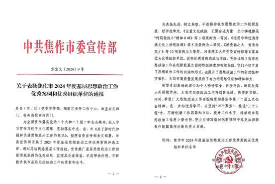 近日,中共焦作市委宣傳部下發了《關于表揚焦作市2024年度基層思想政治工作優秀案例和優秀組織單位的通報》,我校經濟管理學院報送的《首創學生政治指導員制度、打造思政育人新高地》榮獲焦作市基層思想政治工作優秀案例二等獎,校黨委宣傳統戰部榮獲優秀組織單位。