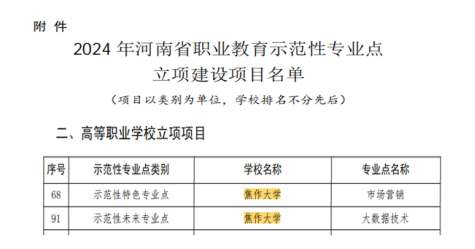 近日,河南省教育廳正式公布了2024年河南省職業(yè)教育示范性專業(yè)點(diǎn)立項(xiàng)建設(shè)項(xiàng)目名單(教職成〔2024〕258 號(hào)),我校經(jīng)濟(jì)管理學(xué)院的市場(chǎng)營(yíng)銷專業(yè)與人工智能學(xué)院的大數(shù)據(jù)技術(shù)專業(yè)成功入選,分別獲批2024年省級(jí)示范性特色專業(yè)點(diǎn)、示范性未來專業(yè)點(diǎn)立項(xiàng)建設(shè)項(xiàng)目。
