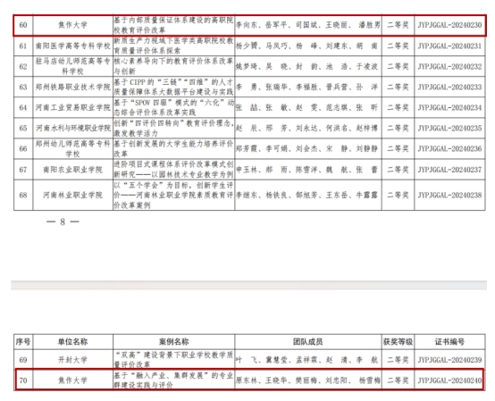 近日,河南省教育廳辦公室公布了2024年河南省教育評價改革優秀案例評選結果。我校質量管理與發展規劃處完成的《基于內部質量保證體系建設的高職院校教育評價改革》和化工學院完成的《基于“融入產業、集群發展”的專業群建設實踐與評價》教育評價改革優秀案例均榮獲二等獎。