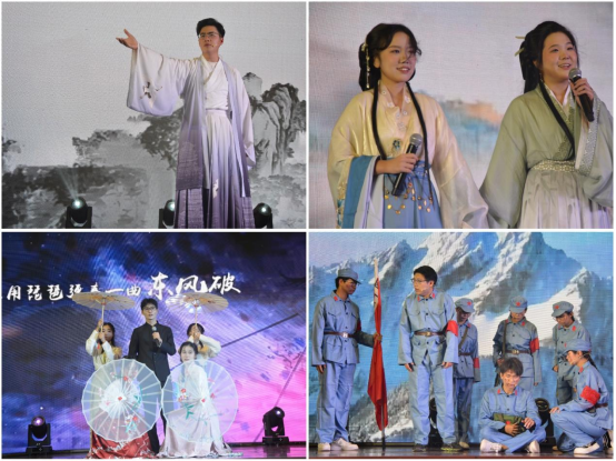 在古詩朗誦《蜀道難》中,我們與古人同游,仿佛共處蜀道之崢嶸、崎嶇,體驗一場穿越時空的文化之旅;在舞蹈《洛春賦》中,舞者用她優美的舞姿帶我們走進洛水之春,去領略那繁花似錦、生機盎然的美妙世界;一首《東風破》,讓我們進入一個詩意盎然的世界;在情景劇《豐碑》中,我們仿佛身處戰爭年代,切身感受先烈們不屈的品格與堅韌的意志,弘揚先烈精神,賡續紅色血脈;小品《霸總看病》以意象性的動作和語言,讓現實與文學的碰撞更加具象化;《筆墨山河》讓我們深深感受書法與朗誦的完美結合,感受中華文化的博大精深,領略藝術的無窮魅力。