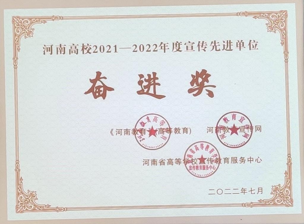 近日,河南教育新聞中心公布河南高校2021-2022年度宣傳先進單位、優秀通訊員、優秀新聞作品評選結果,我校獲評“河南高校2021—2022年度宣傳先進單位 奮進獎”,侯道崢老師獲評“河南高校2021—2022年度優秀通訊員”。