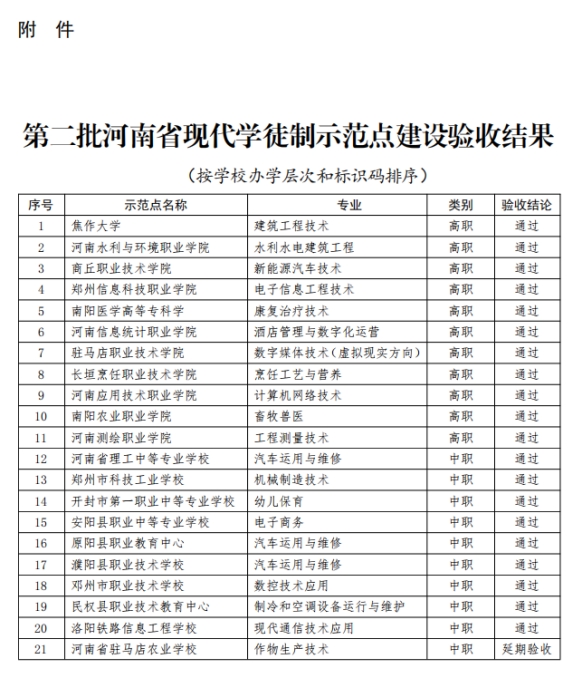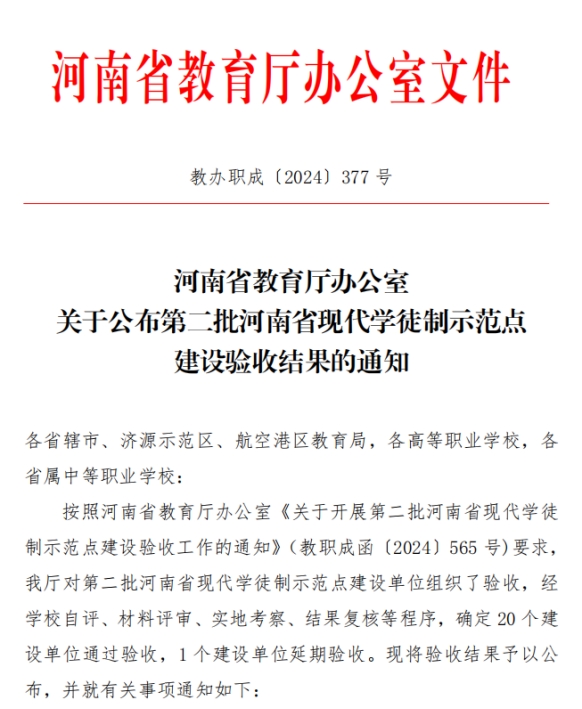 2024年12月6日,河南省教育廳辦公室下發《關于公布第二批河南省現代學徒制示范點建設驗收結果的通知》,我校土木建筑工程學院建筑工程技術專業順利通過現代學徒制示范點建設驗收。