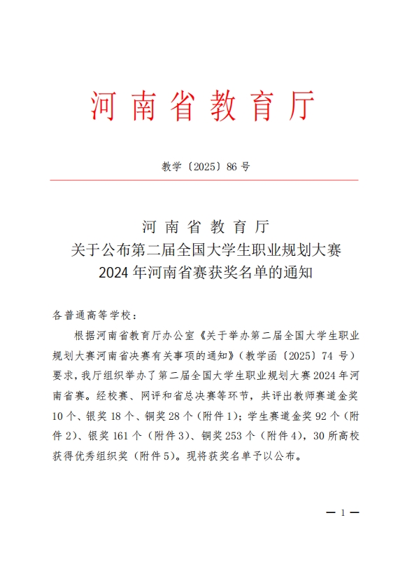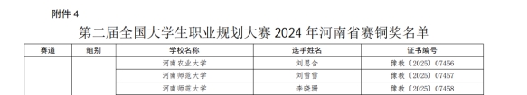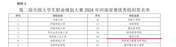 近日,河南省教育廳公布了第二屆全國大學生職業規劃大賽2024年河南省賽獲獎名單。我校化工與環境工程學院黃佳楠同學榮獲成長賽道職教組金獎,人工智能學院周嘉惠同學榮獲就業賽道職教組銀獎,人工智能學院王森同學榮獲成長賽道職教組銅獎,學校榮獲“優秀組織獎”。
